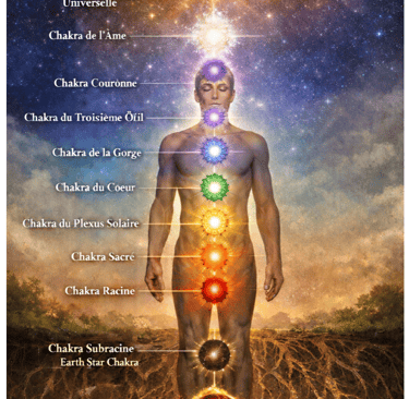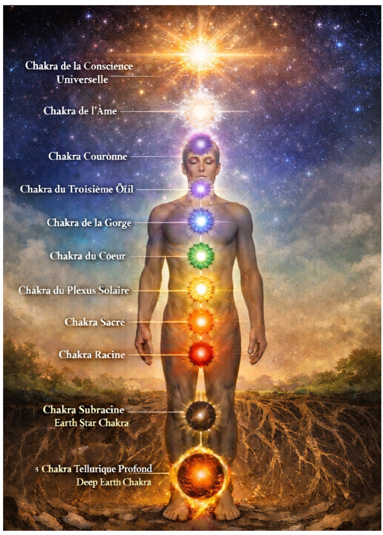- 7 chakras centraux → liés à l’expérience humaine consciente